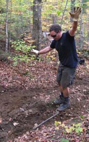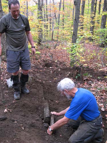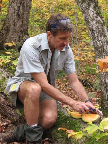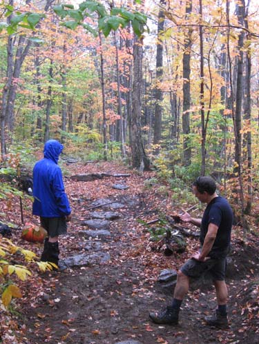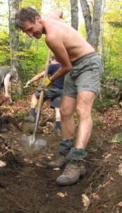You don't need me to tell you that after two months of drought, all we had to do was complain once, and not loudly, that it was so dry we couldn't tell where the steps stones were needed, for it to open up and dump rain all afternoon. Well, we did need the rain. We worked north of Whiteface Mountain on the Long Trail, repairing eroded trail and making solid, dry treadway. This has been an ongoing project over many years and it is fun to hike in over past work and see how it is all adding up. In the pictures you can see we put in a number of stepping stones. Bruce and John are building a waterbar. Scott is prompting us to ponder . . . "is there a hyphen in Baryshnikov-esque?" Tom is just doing what he is told. Except for the cantaloupe. The cantaloupe was all his idea.